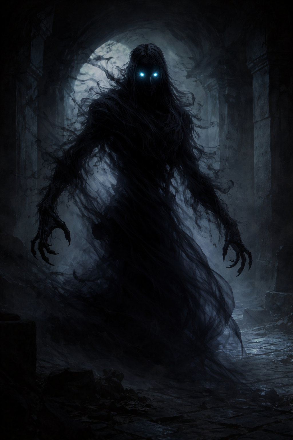 Ihre Gliedmaßen wirken verlängert und knochig, wodurch ihre Silhouette grotesk und verzerrt erscheint. Wenn sie sich bewegen, scheint ihr Körper mit den Schatten zu verschmelzen, sodass ihre Konturen nur schwer zu erkennen sind.