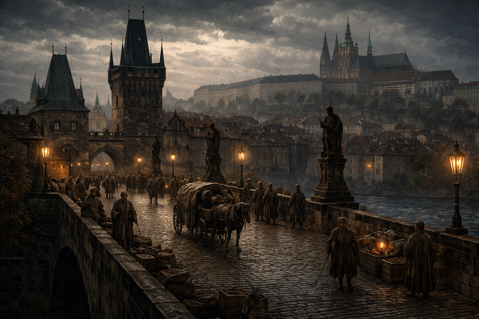 Die Karlsbrücke verbindet die Altstadt mit der Kleinseite und überspannt die Moldau wie eine steinerne Lebensader der Stadt. In friedlicheren Zeiten war sie ein Ort voller Bewegung und Handel – Händler, Pilger und Reisende aus ganz Europa überquerten hier täglich den Fluss.